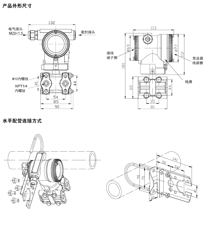 | 安装注意事项/Installation precautions-----------------------------------------------◆◆①防止变送器与腐蚀性或过热的补测介质相接触。 ②要防止渣滓在导压管内沉积。 ③导压管要尽可能短一些。 ④两边导压管内的液柱压头应保持平衡。 ⑤导压管应安装在温度梯度和温度波动小的地方。 ⑥防止引压管内结晶或低温结冰。 ⑦请勿将排气/排液阀全部拧开,以免密封钢珠掉落! |